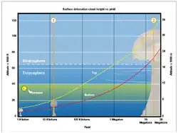 Si une bombe nucléaire de 50 kilotonnes, ce qui est notablement plus élevé que l'énergie combinée de Little Boy et de Fat Man, détonnait à la surface de la Terre, cela résulterait en une boule de feu de 160 mètres de diamètre qui durerait un peu plus d’une seconde[réf. nécessaire]. Dans un rayon d'environ trois kilomètres la chaleur dégagée serait suffisante pour brûler mortellement toute personne non protégée, et le souffle serait suffisant pour détruire la plupart des résidences et des immeubles commerciaux. À deux kilomètres, la plupart des personnes recevraient une dose de radiations de 500 rem (5 Sv). Une telle irradiation suffirait, à elle seule, à entraîner un taux de mortalité entre 50 % et 90 %. Par contre, il est peu probable que quiconque puisse survivre à la fois au souffle et à la chaleur dégagée à cette distance. Dans un rayon d'un kilomètre, pratiquement tout ce qui se trouve au-dessus du sol serait détruit. De grandes quantités de matériaux radioactifs seraient dispersés dans l’atmosphère.