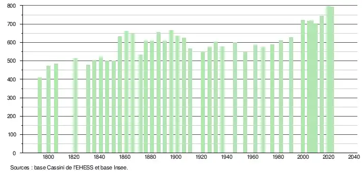 L'évolution du nombre d'habitants est connue à travers les recensements de la population effectués dans la commune depuis 1793. Pour les communes de moins de 10 000 habitants, une enquête de recensement portant sur toute la population est réalisée tous les cinq ans, les populations de référence des années intermédiaires étant quant à elles estimées par interpolation ou extrapolation[23]. Pour la commune, le premier recensement exhaustif entrant dans le cadre du nouveau dispositif a été réalisé en 2004[24].