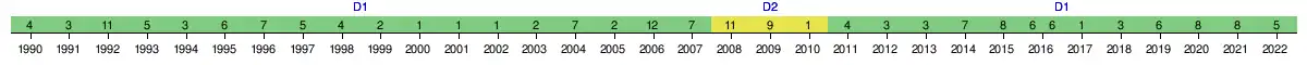 | 2022 | 5e | 54 | 36 | 15 | 9 | 12 | 48 | 48 | 0 | Vainqueur | |