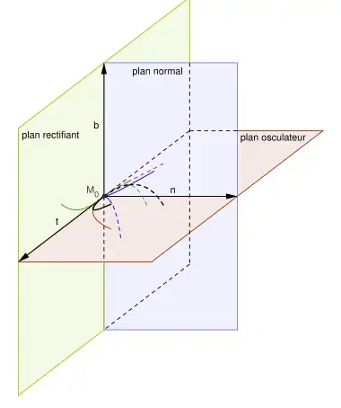 Soit C une courbe de l'espace orienté birégulière (les deux dérivées premières sont indépendantes) de classe supérieure ou égale à 3, paramétrisée par la longueur de l'arc : La dérivée de r donne le vecteur unitaire tangent à la courbe et la dérivée seconde de r est alors un vecteur orthogonal au vecteur tangent dont la norme donne la courbure . Le vecteur normal à la courbe et le vecteur binormal sont donnés par : et où est le produit vectoriel. Ce vecteur est un vecteur normal au plan osculateur.