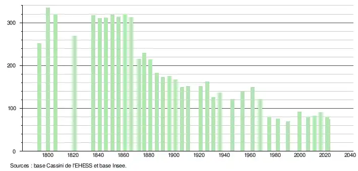 L'évolution du nombre d'habitants est connue à travers les recensements de la population effectués dans la commune depuis 1793. Pour les communes de moins de 10 000 habitants, une enquête de recensement portant sur toute la population est réalisée tous les cinq ans, les populations de référence des années intermédiaires étant quant à elles estimées par interpolation ou extrapolation[27]. Pour la commune, le premier recensement exhaustif entrant dans le cadre du nouveau dispositif a été réalisé en 2006[28].