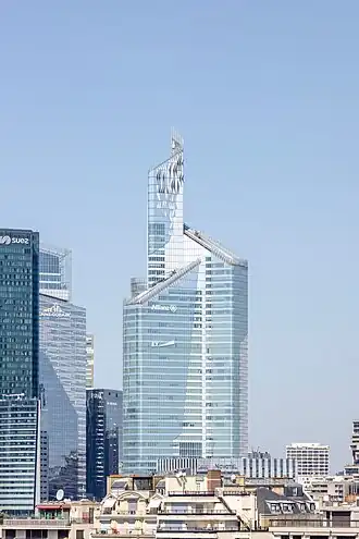 - ↑ Nathalie Giusti, « La tour First se hisse au sommet de la Défense (diaporama) », sur le site du magazine Challenges, (consulté le ).