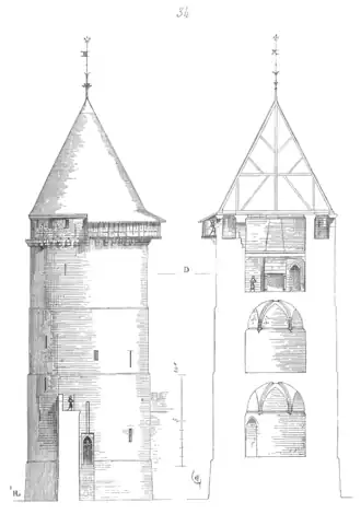 La toiture en poivrière a été rajoutée lors des travaux de restauration, réalisés de 1866 à 1874 par l'architecte en chef de la ville Louis Desmarest, sur les avis de Viollet-le-Duc, et les hourds ont été reconstitués[10].