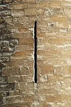 Meurtrière entourée de blocs de pierre de taille datant de la restauration de Jamaer (à gauche, les moellons d'origine) |