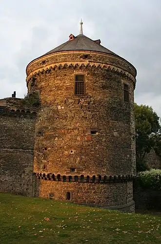 La tour, qui mesure aujourd'hui 18 mètres de haut, repose sur une maçonnerie cylindrique de 13 mètres de haut comprenant trois étages d'un diamètre de 12 mètres, avec une frise trilobée en tuf qui l'entoure à environ 1,60 mètre sous la base du toit. Une autre frise cintrée en fait le tour au niveau du sol, et dessous, le mur prend une forme convexe : il s'agit de la partie autrefois rattachée au mur des douves.