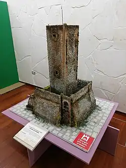 La tour centrale a un plan carré de 5,20 m de côté et possède une entrée orientée à l'est surélevée d'environ m au-dessus du niveau de la cour.