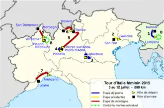 Le parcours du Tour d'Italie 2015 est dévoilé en mars[1]. Cette édition comporte un prologue et neuf étapes. Le prologue, long de deux kilomètres, a lieu à Ljubljana, la capitale de la Slovénie. Les coureuses s'élancent espacées d'une minute entre elles[2]. C'est le premier départ depuis l'étranger du Tour d'Italie féminin[3]. La première étape se court également dans ce pays, entre Kamnik et la capitale et présente peu de difficultés. Un sprint massif semble probable. L'arrivée se trouve dans le centre commercial BTC City, partenaire de l'équipe éponyme. L'épreuve quitte ensuite la Slovénie pour rejoindre le nord de l'Italie. La deuxième étape se déroule en Vénétie et relie Gaiarine à San Fior et comporte trois prix de la montagne : le premier en troisième catégorie puis deux de deuxième catégorie. Elle débute par une partie en ligne, puis effectue un petit circuit urbain à deux reprises avant de commencer un grand tour comportant toutes les difficultés de la journée avec notamment la côte du Calvario situé à huit kilomètres de l'arrivée. La troisième étape se joue entre Curtatone et Mantoue et est plate, si on excepte un prix de la montagne de troisième catégorie en milieu de parcours. C'est la plus longue étape de l'épreuve avec un total de cent trente kilomètres. Les étapes suivantes se déroulent en Lombardie. La quatrième étape entre Pioltello et Pozzo d'Adda est également plate et effectue plusieurs circuits urbains[4],[5],[6].