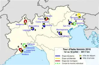 Le circuit présente de nombreuses similitudes avec celui de l'édition précédente. Pas moins de quatre communes étaient déjà villes étapes en 2015 : Gaiarine, San Fior, Varazze et Verbania. Le parcours 2015 a également longé le Lac d'Iseo et avait une étape en circuit en région milanaise. La principale différence est que l'arrivée finale ne se dispute par à San Domenico di Varzo comme en 2014 et 2015. Les profils des étapes les plus vallonnées sont représentés :
