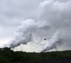 Un tourbillon de vapeur est une colonne tourbillonnante d'air saturé de hauteur variable, généralement verticale et de faible diamètre, se formant quand une masse d'air froid se trouve au-dessus d'une étendue d'eau ou d'une surface saturée beaucoup plus chaude[20]. C'est le cas surtout en hiver, sur les plans d'eau non glacés lorsque la température de l'air est très basse (sous les −15 degrés Celsius[21]), de la vapeur se forme au-dessus de la surface et donne un brouillard glacé, appelé fumée de mer arctique, si les vents sont faibles.