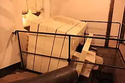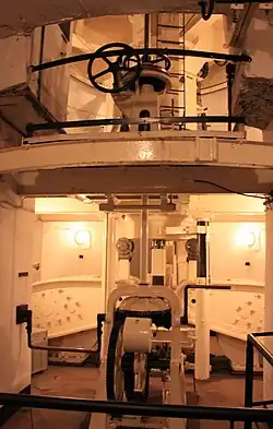 - Le premier est l’étage inférieur où se trouve le treuil de relevage du contrepoids moteur que l’on actionne avec quatre hommes pour préparer la mise en batterie de la tourelle ou effectuer la rotation rapide (environ 60 secondes pour faire un tour complet). On y trouve aussi les contrepoids et les balanciers de la tourelle ainsi qu’un canon de rechange et des magasins à munitions qui peuvent contenir jusqu’à 3 000 obus. Les projectiles sont montés à l’étage intermédiaire grâce à un monte-obus.