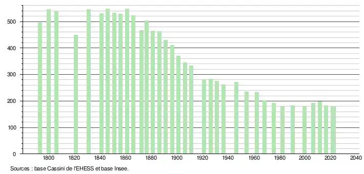 L'évolution du nombre d'habitants est connue à travers les recensements de la population effectués dans la commune depuis 1793. Pour les communes de moins de 10 000 habitants, une enquête de recensement portant sur toute la population est réalisée tous les cinq ans, les populations de référence des années intermédiaires étant quant à elles estimées par interpolation ou extrapolation[25]. Pour la commune, le premier recensement exhaustif entrant dans le cadre du nouveau dispositif a été réalisé en 2006[26].