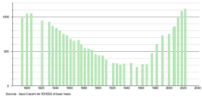 L'évolution du nombre d'habitants est connue à travers les recensements de la population effectués dans la commune depuis 1793. Pour les communes de moins de 10 000 habitants, une enquête de recensement portant sur toute la population est réalisée tous les cinq ans, les populations de référence des années intermédiaires étant quant à elles estimées par interpolation ou extrapolation[19]. Pour la commune, le premier recensement exhaustif entrant dans le cadre du nouveau dispositif a été réalisé en 2007[20].