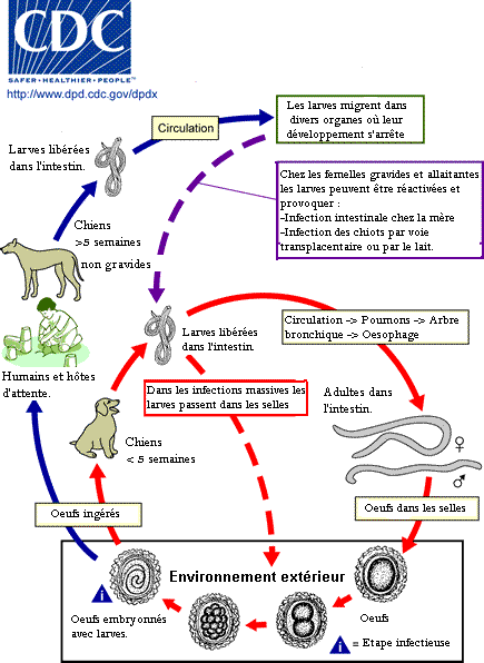 Le cycle reproductif de T. canis est complexe car dépendant de l'âge et du sexe de l'hôte définitif, le chien. Les vers adultes pondent chaque jour des milliers d'œufs qui, rejetés avec les excréments canins, vont s’embryonner dans le sol en 3 semaines si les conditions environnementales sont favorables (ombre, humidité et température autour de 25 °C). Ingérés par un chien, ces œufs éclosent dans le duodénum et libèrent des larves qui passent au travers de la paroi intestinale. Circulant par voie sanguine, elles atteignent le foie qu'elles traversent, rejoignent les poumons où elles quittent les artérioles pulmonaires pour emprunter le lit veineux qui va les amener au cœur gauche. Lancées dans la grande circulation, elles vont finalement s'emboliser dans les organes irrigués où elles tombent dans un état de vie ralentie. Si le chien est un mâle, ces larves n'ont le plus souvent aucun avenir et finiront par mourir dans les tissus. Il est rare qu'elles poursuivent leur évolution pour donner des vers adultes dans le tube digestif. Si le chien est une femelle, et que celle-ci devient gestante, l'imprégnation hormonale va réactiver les larves qui vont parasiter les embryons (stade 4 du cycle parasitaire). Au cours de la gestation, les larves évoluent chez ceux-ci pour donner des vers adultes : les chiots sont donc parasités dès la naissance et sont le principal facteur de contamination de l'environnement. Le parasitisme des chiots est entretenu par l'allaitement, au cours duquel des larves passent des tissus maternels dans le lait.