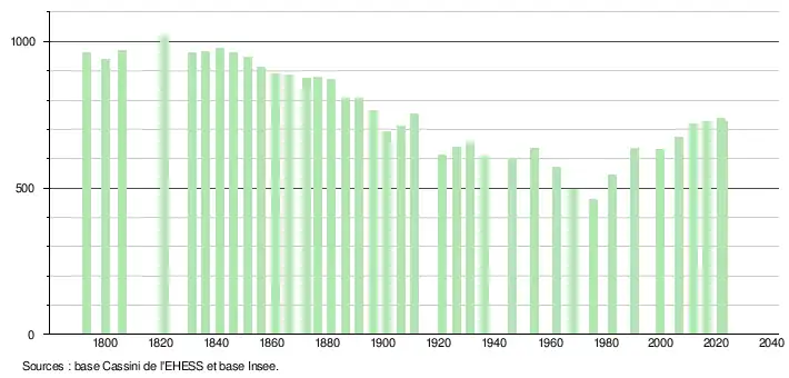 L'évolution du nombre d'habitants est connue à travers les recensements de la population effectués dans la commune depuis 1793. Pour les communes de moins de 10 000 habitants, une enquête de recensement portant sur toute la population est réalisée tous les cinq ans, les populations de référence des années intermédiaires étant quant à elles estimées par interpolation ou extrapolation[41]. Pour la commune, le premier recensement exhaustif entrant dans le cadre du nouveau dispositif a été réalisé en 2006[42].