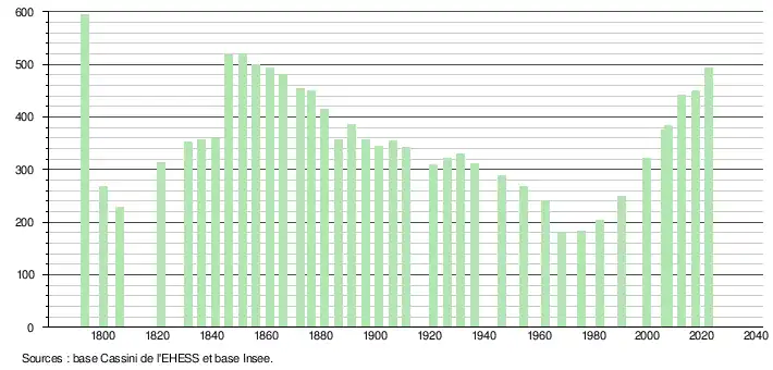 L'évolution du nombre d'habitants est connue à travers les recensements de la population effectués dans la commune depuis 1793. Pour les communes de moins de 10 000 habitants, une enquête de recensement portant sur toute la population est réalisée tous les cinq ans, les populations de référence des années intermédiaires étant quant à elles estimées par interpolation ou extrapolation[30]. Pour la commune, le premier recensement exhaustif entrant dans le cadre du nouveau dispositif a été réalisé en 2007[31].