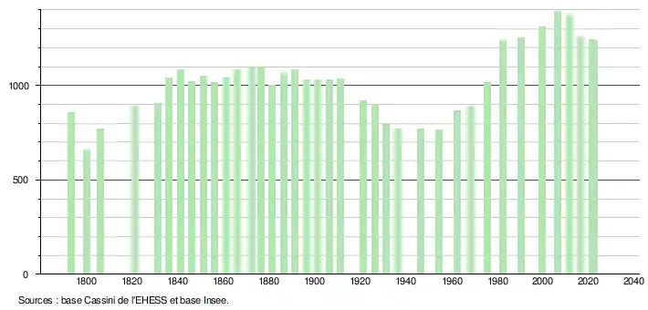 L'évolution du nombre d'habitants est connue à travers les recensements de la population effectués dans la commune depuis 1793. Pour les communes de moins de 10 000 habitants, une enquête de recensement portant sur toute la population est réalisée tous les cinq ans, les populations de référence des années intermédiaires étant quant à elles estimées par interpolation ou extrapolation[38]. Pour la commune, le premier recensement exhaustif entrant dans le cadre du nouveau dispositif a été réalisé en 2006[39].