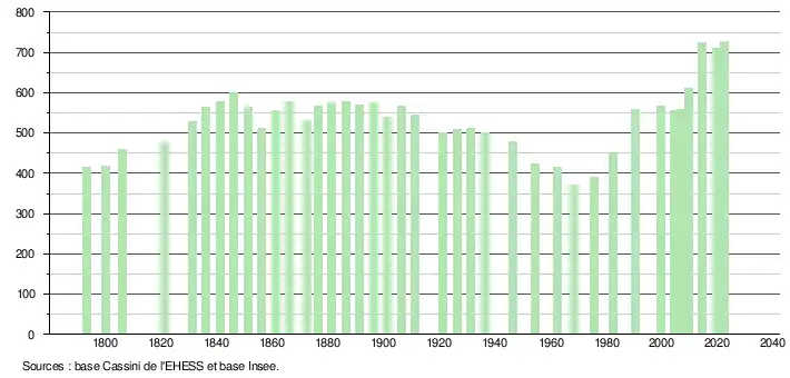 L'évolution du nombre d'habitants est connue à travers les recensements de la population effectués dans la commune depuis 1793. Pour les communes de moins de 10 000 habitants, une enquête de recensement portant sur toute la population est réalisée tous les cinq ans, les populations de référence des années intermédiaires étant quant à elles estimées par interpolation ou extrapolation[23]. Pour la commune, le premier recensement exhaustif entrant dans le cadre du nouveau dispositif a été réalisé en 2004[24].