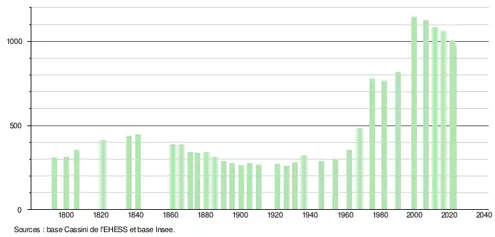 L'évolution du nombre d'habitants est connue à travers les recensements de la population effectués dans la commune depuis 1793. Pour les communes de moins de 10 000 habitants, une enquête de recensement portant sur toute la population est réalisée tous les cinq ans, les populations de référence des années intermédiaires étant quant à elles estimées par interpolation ou extrapolation[17]. Pour la commune, le premier recensement exhaustif entrant dans le cadre du nouveau dispositif a été réalisé en 2006[18].