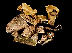 Le trésor comprend plus de 1 500 objets[7]. On y trouve des décorations d'or et d'argent finement ouvragées, détachées des armes auxquelles elles appartenaient à l'origine, parmi lesquelles 66 anneaux de garde d'épée et de nombreuses plaques en or provenant de gardes, certaines avec des incrustations décrites comme des grenats zoomorphiques cloisonnés[13].