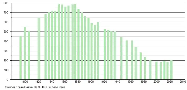 | L'évolution du nombre d'habitants est connue à travers les recensements de la population effectués dans la commune depuis 1793. Pour les communes de moins de 10 000 habitants, une enquête de recensement portant sur toute la population est réalisée tous les cinq ans, les populations de référence des années intermédiaires étant quant à elles estimées par interpolation ou extrapolation[28]. Pour la commune, le premier recensement exhaustif entrant dans le cadre du nouveau dispositif a été réalisé en 2006[29]. En 2022, la commune comptait 200 habitants[Note 5], en évolution de +8,11 % par rapport à 2016 (Tarn : +2,52 %, France hors Mayotte : +2,11 %). |