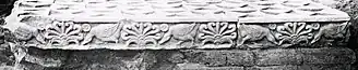 Le trône est une épaisse plaque de grès poli gris mesurant 2,39 m de long, 1,40 m de large et 1,83 m d'épaisseur. La surface supérieure est sculptée de motifs géométriques. Le côté est constitué d'une bande décorative sculptée d'oies et de palmettes. La frise à l'avant est différente : elle est constituée de lotus stylisés avec des calices et des palmettes à flammes.