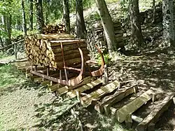 Le traînage dès l'époque néolithique permet le transport de lourdes charges, même à plat et sur tous les terrains. Autrefois, le traîneau pouvait n'être qu'un plancher résistant, supportant une lourde charge, qui glissait ou se déplaçait sur des rails formés d'un agencement de multiples traverses en rondins, parfois roulantes si le sol était suffisamment dur. À la limite, si le corps était rigide, par exemple une longue pierre, un menhir ou un obélisque, la traîne était limitée aux rondins roulants ou replacés inlassablement à l'avant par les hommes à la manœuvre. Que ce soit au Japon ou dans les Vosges, les voies de rondins[3], parfois très élaborées dans les endroits dangereux, permettaient de faire circuler des traîneaux en bois lourdement chargés. Ces voies pouvaient être aussi pavées de galets, qui, arrosés, devenaient lisses et glissants, comme à Madère. Dans le cas de traction ou de freinage en pentes assez fortes, les animaux devaient être robustes et calmes, et souvent les hommes étaient indispensables en présence de fortes pentes.