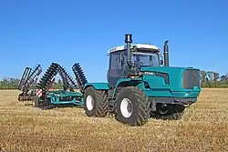 Le tracteur agricole dans sa forme la plus classique possède un moteur en position longitudinale et quatre roues. Les roues arrière toujours motrices sont de plus grand diamètre que les roues avant directrices. Les tracteurs à deux roues motrices sont de plus en plus rares. En effet, les agriculteurs utilisent des tracteurs de plus en plus puissants, demandant plus d'adhérence[24] et donc à quatre roues motrices. Le poste de conduite du tracteur peut être ouvert ou constitué d'une cabine dans laquelle le conducteur prend place sur un siège unique. Les tracteurs modernes sont plus confortables (cabine suspendue, climatisée, siège pneumatique).