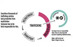 Les efforts de lutte contre le trafic sexuel sont souvent associés à la lutte contre la prostitution ; toutefois, cette association soulève souvent des problèmes concernant les recours juridiques dont disposent les victimes. Si — en théorie du moins — les personnes prostituées exercent leur activité de leur plein gré, les victimes de trafic y sont contraintes. De nombreux États, conscients de ce fait, ont adopté des législations qui, dans leurs dispositions relatives à la prostitution, exemptent de poursuites des victimes de trafic sexuel ; néanmoins, de nombreuses victimes n'en bénéficient pas, par manque d'information en matière juridique et en raison de préjugés systémiques[94]. Ainsi, les victimes de trafic sexuel s'exposent souvent aux poursuites pénales quand elles alertent les autorités sur leurs problèmes.