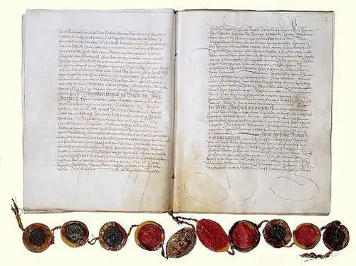 Le document pacificateur était si important aux sujets qu'il a été mis à l'abri dans la ville d'Empire, à l'intérieur d'une caissette fermée par quatre serrures. Il est conservé maintenant aux archives d'État d'Augsbourg.