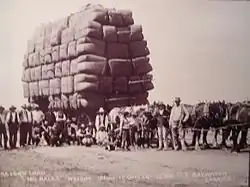 Un équipage de traits australiens réalisant un record en tractant une charge de 150 balles de laine.