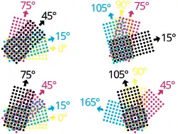 En couleurs, on utilise une trame de points pour chaque couleur primaire, cyan, magenta et jaune, plus le noir, effectuant une synthèse soustractive des couleurs limitées au gamut permis par les trois couleurs primaires.