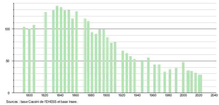 L'évolution du nombre d'habitants est connue à travers les recensements de la population effectués dans la commune depuis 1793. Pour les communes de moins de 10 000 habitants, une enquête de recensement portant sur toute la population est réalisée tous les cinq ans, les populations de référence des années intermédiaires étant quant à elles estimées par interpolation ou extrapolation[23]. Pour la commune, le premier recensement exhaustif entrant dans le cadre du nouveau dispositif a été réalisé en 2005[24].