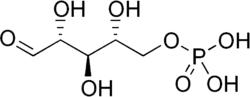 - Dans la première réaction catalysée par la transcétolase dans la voie des pentoses phosphates, la thiamine pyrophosphate accepte un fragment à deux atomes de carbone du D-xylulose-5-phosphate, un cétose à cinq atomes de carbone, et transfère ce fragment au D-ribose-5-phosphate, un aldose à cinq atomes de carbone, pour former du sédoheptulose-7-phosphate, un cétose à sept atomes de carbone, ainsi que du glycéraldéhyde-3-phosphate, un aldose à trois atomes de carbone ; dans le cycle de Calvin, la transcétolase catalyse la réaction inverse, c'est-à-dire la conversion du sédoheptulose-7-phosphate et du glycéraldéhyde-3-phosphate en ribose-5-phosphate et xylulose-5-phosphate, ce qui constitue la seconde intervention de cette enzyme dans cette voie métabolique.