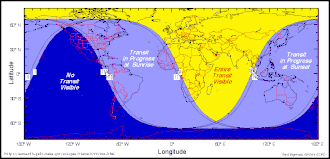 Ce transit était entièrement visible depuis l'Europe, l'Asie et l'Afrique, tandis que seulement la fin du transit était visible de l'Amérique du Nord. Il ne fut pas observable depuis l'Ouest de l'Amérique du Nord, ainsi que d'Hawaii et de la Nouvelle-Zélande, alors plongés dans la nuit.