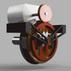 Le moteur, placé au-dessus de l'essieu, fixé au châssis, entraîne par un pignon une couronne dentée (de taille légèrement inférieure à la roue) située en porte-à-faux à l'extérieur des roues de l'essieu et supportée par une pièce rigide au châssis. Le voile de la roue possède deux manetons qui sont reliés à la couronne dentée par deux biellettes articulées rendues solidaires par deux secteurs dentés qui se font face. Les variations de distance entre les points d'attache sur la roue et sur la couronne dentée lors des mouvements (essentiellement verticaux) de l'essieu sur la voie sont pris en charge par la rotation des secteurs dentés. Les articulations sphériques des biellettes autorisent également le jeu transversal des essieux lors de leur inscription en courbe.