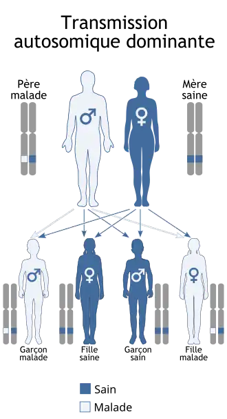 L'allèle morbide est transmis soit par le père soit par la mère (ou par les deux, s'ils ont la même maladie génétique de transmission autosomique dominante).