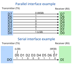 D'autre part, une liaison série requiert un nombre de voies de transmission plus faible, et donc un gain de broches particulièrement intéressant pour les micro-puces puisqu'il entraine une diminution de la taille et donc du prix de celles-ci[réf. nécessaire].