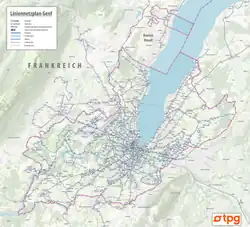 Le réseau des Transports publics genevois s'étend sur 426,490 km à travers le canton de Genève, quelques communes du canton de Vaud et les régions transfrontalières françaises voisines, incluant notamment Gex et Saint-Julien-en-Genevois[36]. En 2019, il a assuré 227 845 milliers de voyages dont 767 000 voyages sur les lignes nocturnes[27].