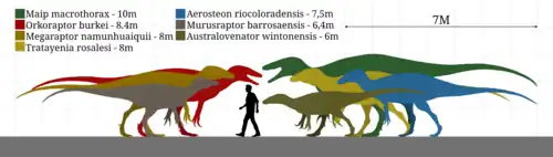 Le cladogramme ci-dessous suit le consensus strict (résultat moyen) des 12 arbres les plus parcimonieux (les chemins évolutifs les plus simples, en termes de quantité totale de caractéristiques échantillonnées évoluées ou perdues entre les taxons échantillonnés) trouvés par l'analyse phylogénétique de Porfiri et al. (2018)[1]. Bien que les résultats soient différents, l'analyse de la méthodologie était pratiquement identique à celle d'Apesteguia et al. (2016), ne différant que par le fait qu'elle incorporait Tratayenia et Murusraptor, deux Megaraptora non échantillonnés dans l'analyse d'Apesteguia et al.[5],[6]