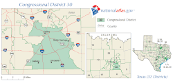 Le 30e district congressionnel du Texas couvre une grande partie de la ville de Dallas et d'autres parties des comtés de Dallas et de Tarrant (principalement des zones à majorité noire et hispanique). Le district comprend l'Université du Nord du Texas à Dallas, l'UNT Law et la Texas Women's University à Dallas. Le 30e district abrite également l'Aéroport de Dallas Love Field et le Centre Médical Southwestern de l'Université du Texas.
