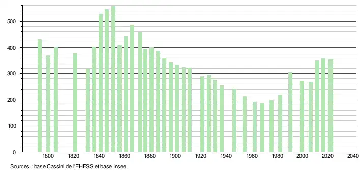 L'évolution du nombre d'habitants est connue à travers les recensements de la population effectués dans la commune depuis 1793. Pour les communes de moins de 10 000 habitants, une enquête de recensement portant sur toute la population est réalisée tous les cinq ans, les populations de référence des années intermédiaires étant quant à elles estimées par interpolation ou extrapolation[20]. Pour la commune, le premier recensement exhaustif entrant dans le cadre du nouveau dispositif a été réalisé en 2006[21].