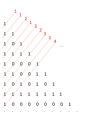 Le nombre de coefficients impairs dans les « diagonales ascendantes » du triangle de Pascal forme la suite diatomique de Stern. Ci-dessus, les nombres impairs ont été remplacés par des 1 et les nombres pairs par des 0.