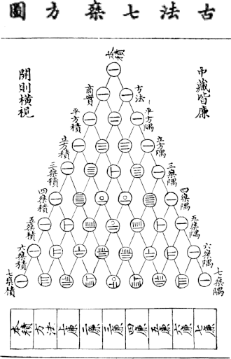 La tradition occidentale attribue le nom de triangle de Pascal au triangle décrit plus haut. Cependant, ce triangle était déjà connu en Orient et au Moyen-Orient plusieurs siècles avant la publication de Blaise Pascal. Il était ainsi connu des mathématiciens persans, par exemple al-Karaji (953-1029)[1] ou Omar Khayyam au XIe siècle ou des mathématiciens du Maghreb comme Ibn al-Banna[2] et ses disciples qui l'utilisent pour développer (a + b)n. Il apparaît en Chine dès 1261 dans un ouvrage de Yang Hui (au rang 6) et dans le Miroir de jade des quatre éléments de Zhu Shijie en 1303 (au rang 8). Yang Hui attribue la paternité du triangle au mathématicien chinois du XIe siècle Jia Xian. Ce triangle permettait de présenter les coefficients des différents termes dans la formule du binôme et, selon Victor J. Katz, il était utilisé pour généraliser à des degrés supérieurs à 2 la méthode d'extraction de racine[3].