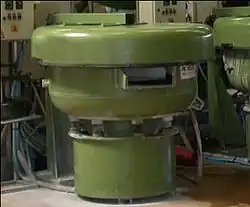 - bols vibrants (aussi appelés vibrateurs circulaires) : pour les pièces de dimensions modestes (< 100 mm) les équipements les plus courants utilisent un mouvement vibratoire imposé à une cuve torique (dont l‘axe de révolution est vertical), ce qui engendre un déplacement des pièces et des médias à la fois autour de l'axe de la cuve, et circulairement dans le profil de la cuve. Ces cuves sont souvent munies d'un couvercle pour éviter l'évaporation de l'eau et limiter les éclaboussures ;
