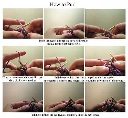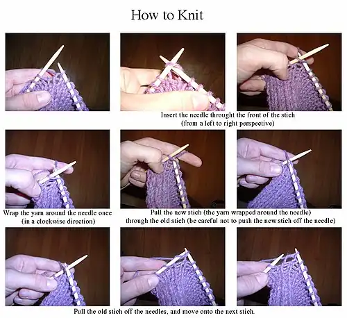 Le fil est tenu par la main gauche, le mouvement du poignet droit est utilisé pour glisser l'aiguille droite dans la boucle du point tricoté et «ramasser» ou «accrocher» le fil sur l'aiguille droite[1].