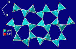 Sa structure est constituée de couches de tétraèdres orientés alternativement dans les deux sens de l'axe sénaire (axe cristallographie c). Chaque couche est reliée à deux autres couches, supérieure et inférieure, pour former une structure tridimensionnelle. Dans la structure on peut reconnaître des canaux formés par des hexagones de tétraèdres, plus ou moins déformés.
