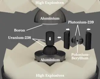Dans l'assemblage final, le cœur en plutonium était placé au milieu de deux demi-cylindres en uranium. Cet élément surnommé slug était positionné dans une sphère en uranium de centre creux, elle-même placée entre deux hémisphères en aluminium au contact des lentilles explosives. Cette conception différente du simple assemblage de sphères sous la forme de poupées gigognes était liée à des questions de sécurité : le slug contenant les éléments nucléaires pouvait être assemblé plus facilement et maintenu aussi longtemps que possible à l'écart des explosifs. Le choix de l'uranium pour le slug et la sphère centrale était lié à sa densité, qui permettrait de maintenir le cœur comprimé lors de la réaction en chaîne, et d'obtenir le meilleur rendement possible. Cet uranium n'était pas enrichi, et n'était pas destiné à participer à la réaction en chaîne initiale, mais des études ultérieures de l'essai Trinity révélèrent qu'environ 30 % de son énergie était liée à la fission de l'uranium[43] induite par les neutrons rapides de l'explosion.