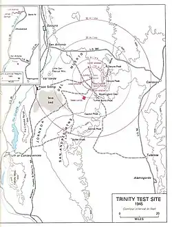 Dans les deux semaines précédant le test, environ 250 personnes de Los Alamos travaillaient sur le site de Trinity[51], et la police militaire du lieutenant Bush comptait alors 125 hommes, chargés de surveiller et d'entretenir le camp de base. Cent soixante hommes sous le commandement du major T. O. Palmer étaient stationnés en dehors de la zone interdite, dans l'éventualité où une évacuation de la population serait nécessaire[52]. Ils avaient suffisamment de véhicules pour transporter 450 personnes jusqu'à la base d'Alamogordo, où des infrastructures avaient été construites pour les accueillir[53]. Groves avertit par ailleurs le gouverneur du Nouveau-Mexique John J. Dempsey qu'il aurait peut-être à faire appliquer la loi martiale dans le sud-ouest de l'État[54].