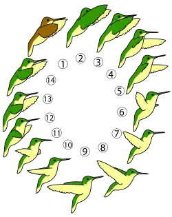 La structure osseuse de leurs ailes que l'on ne retrouve qu'au niveau du poignet des autres oiseaux assure une mobilité des épaules unique alors qu'elle est axée sur le seul mouvement vertical dirigé de haut en bas pour les autres oiseaux. Les oiseaux-mouches, grâce aux particularités de leur squelette, peuvent battre des ailes dans toutes les directions et faire des prouesses aériennes inégalées. Ils peuvent voler sur place en effectuant des mouvements de leurs ailes en forme de 8. Ils sont les seuls oiseaux capables de voler en arrière[27]. Leurs cabrioles peuvent être effectuées à une vitesse moyenne de 30 à 45 kilomètres par heure. Le vol d'avant en arrière ou le vol en piqué peuvent atteindre 96 kilomètres par heure avec jusqu'à 200 battements par seconde pour un vol en plongée. Selon des chercheurs américains, cet oiseau parvient à faire du sur-place en battant des ailes à 75 % vers le bas et à 25 % vers le haut[28]. Cette façon de voler rappelle le vol de certains insectes comme celui des Sphingidae.