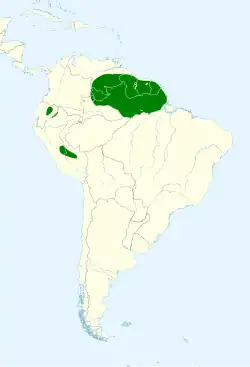 Cet oiseau se rencontre au Brésil, en Équateur, au Guyana, en Guyane, au Pérou, au Suriname et au Venezuela[1].
